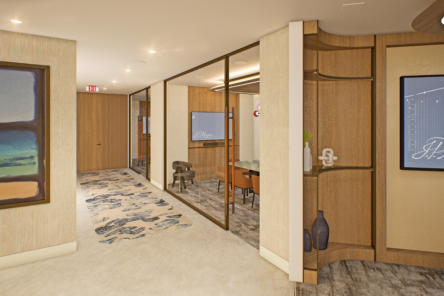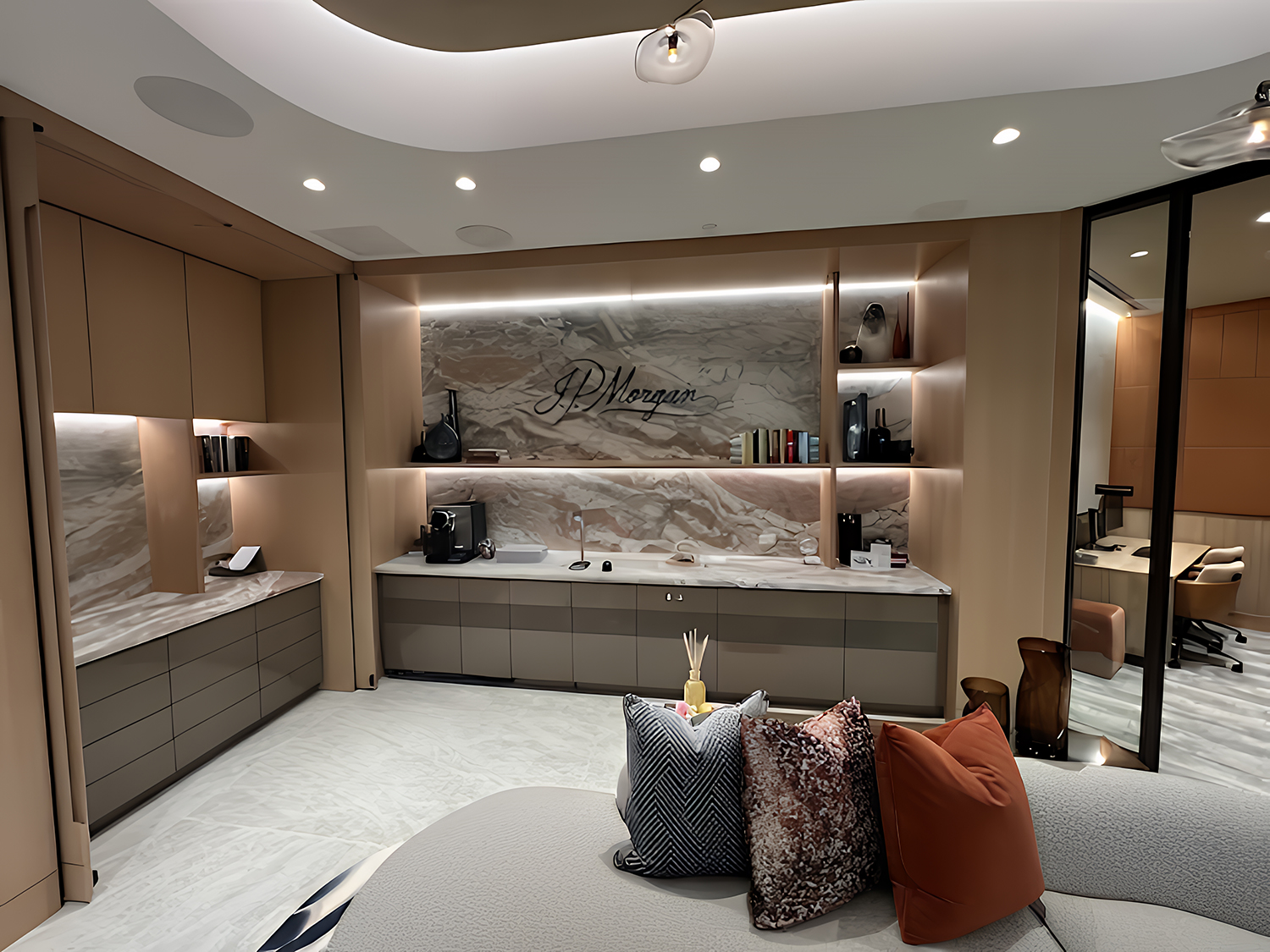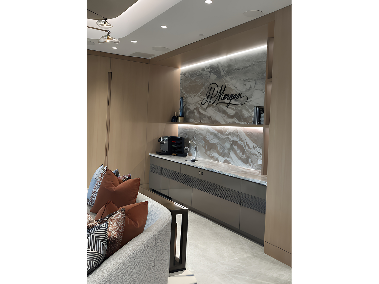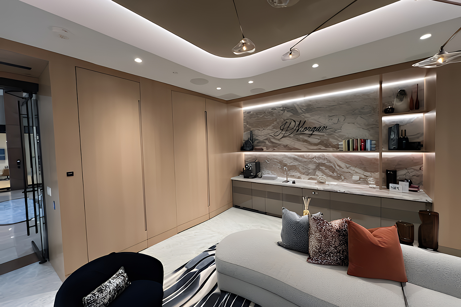 - Scope of Work: Architectural millwork and custom client-facing fixtures, panels, doors, including wood, stone, and metal integrations. All elements were fabricated and installed to align with the design intent and performance expectations of a flagship financial environment.