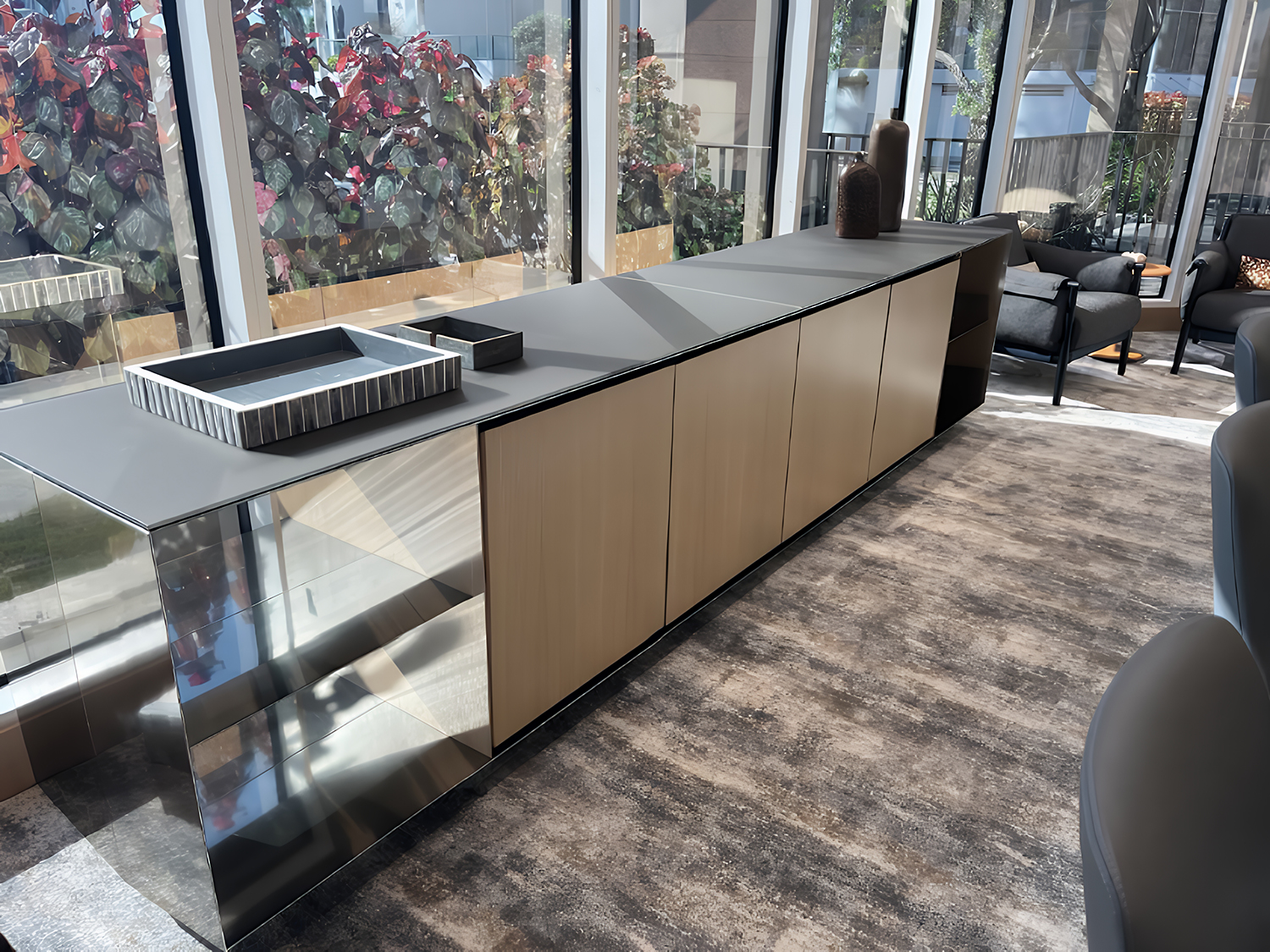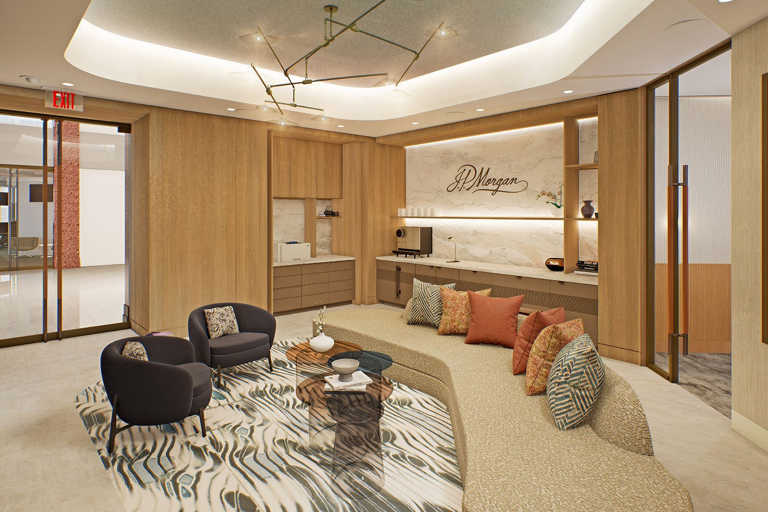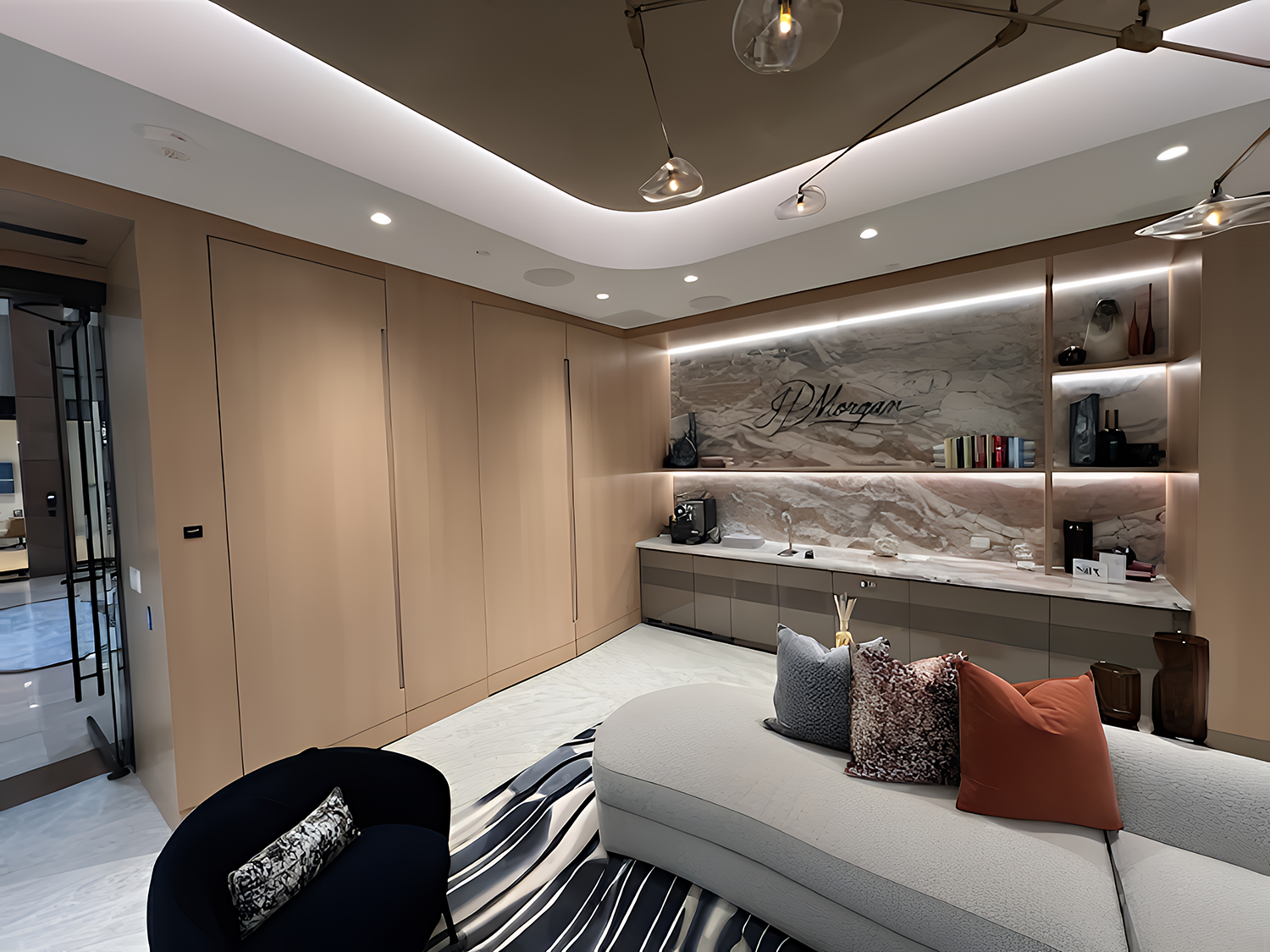 - Scope of Work: Architectural millwork and custom client-facing fixtures, panels, doors, including wood, stone, and metal integrations. All elements were fabricated and installed to align with the design intent and performance expectations of a flagship financial environment.